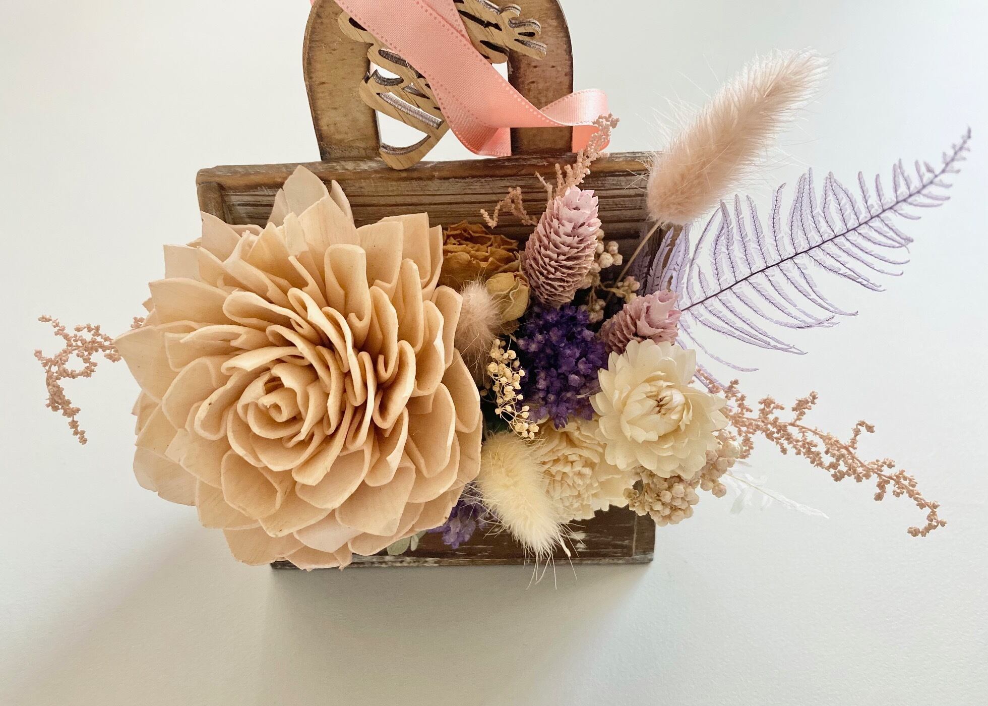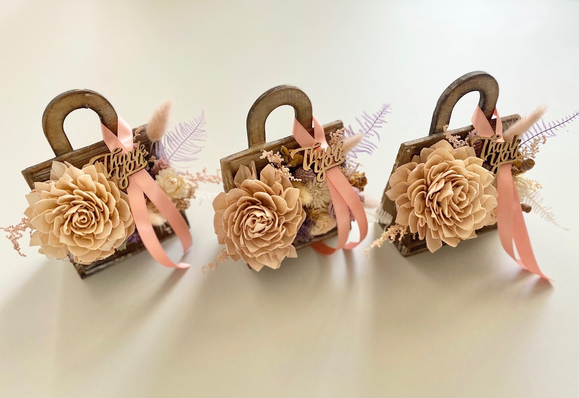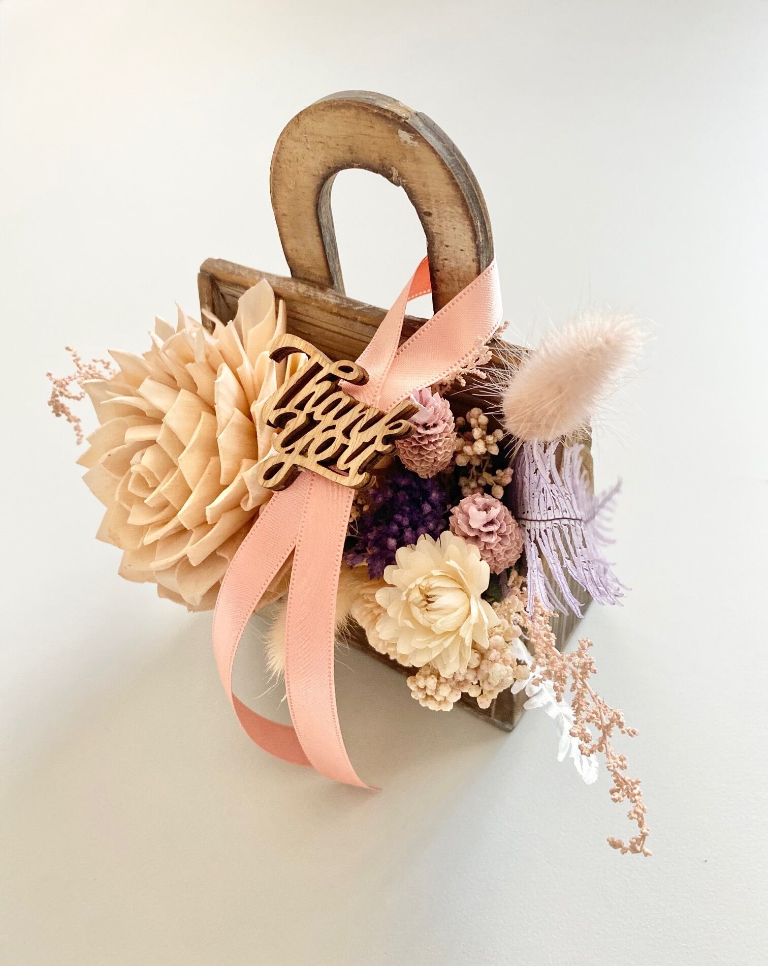 ドライフラワーとソーラーフラワー(木の皮でできたお花)を使ったアレンジメント。THANK YOUのウッドタグ付き。