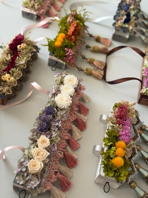 プリザーブドフラワーをメインに使用し、少しだけドライフラワーを入れています。