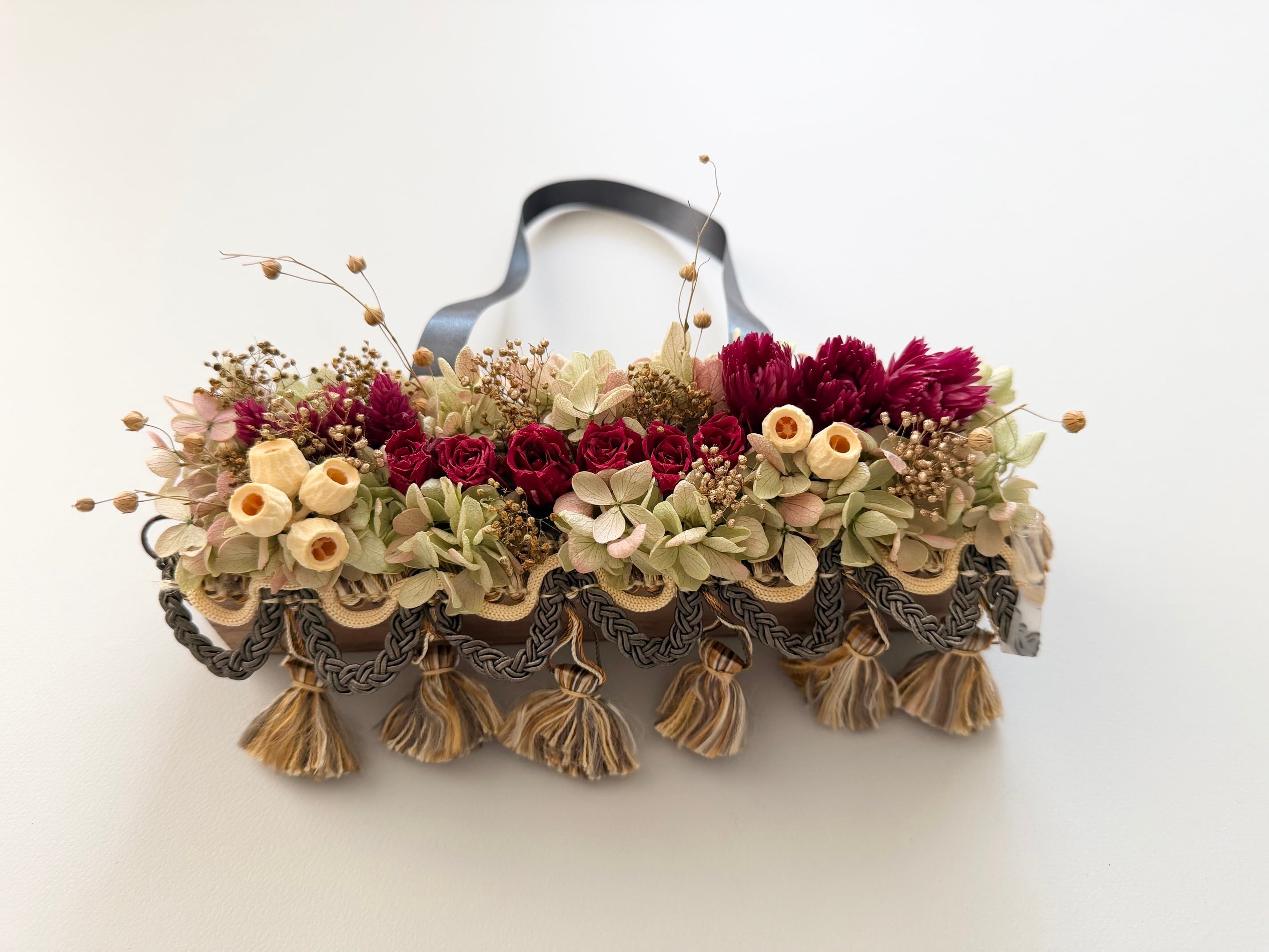 ウッドボックスにフリンジタッセルガーランドを付けたオリジナルフラワーアレンジメント。