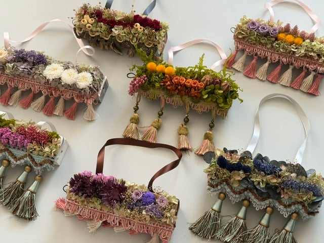 プリザーブドフラワーをメインに使用し、少しだけドライフラワーを入れています。